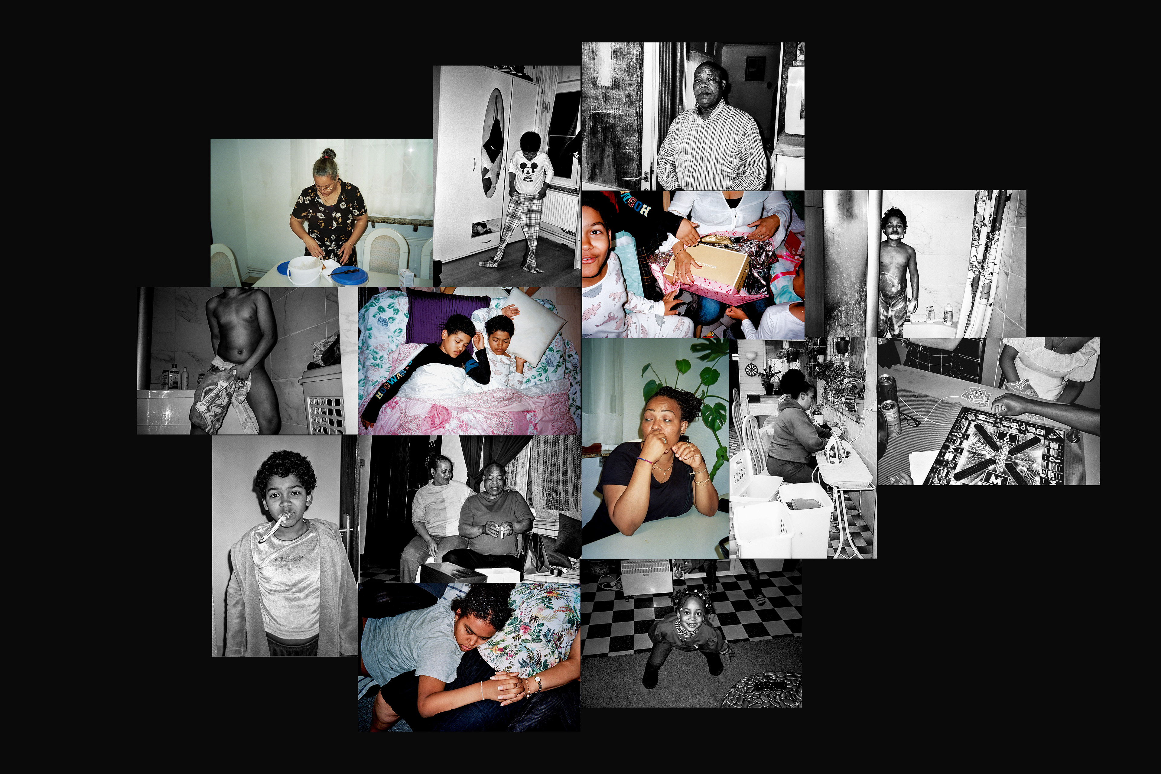 Alongside the portraits sit fragments from another generation. Family archive images, domestic interiors, the adults who came before. Not as explanation, but as context. This is the world the boys are inheriting. The rooms, the bodies, the silences. The weight that gets passed down before anyone thinks to ask whether the child wants to carry it.