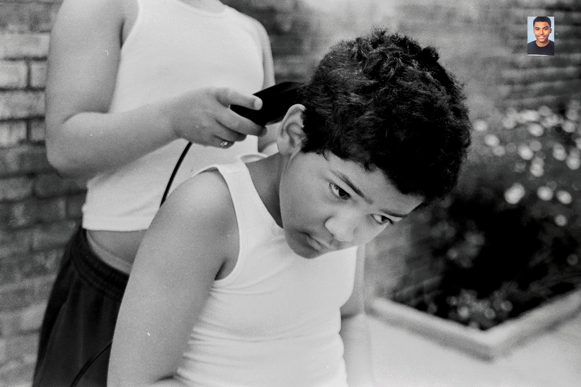 The images don't explain what they show. A boy getting his hair cut. Two brothers in a room at night. A fish held in a plastic bag. A tattoo that reads Nothing Less. These are ordinary moments. The weight inside them is not.